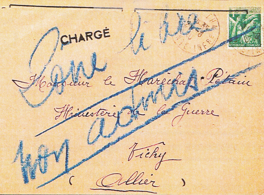 Des milliers de correspondances ont été adressées à Pétain et le timbre-poste au type Iris est celui de la lettre ordinaire. De là à déduire que cette enveloppe ne présente aucun intérêt il n’y a qu’un pas. Mais il serait dommage de le franchir car cette enveloppe a été postée durant la courte période de blocage total du courrier imposé par l’occupant et si à cela on ajoute des erreurs postales, certes mineures, faites sur son recto et son verso, nous avons là un document témoin actif de l’histoire.