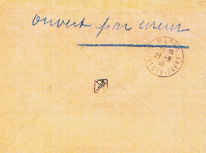 Le 1er août, sans préavis, l’occupant suspend les relations postales entre les deux zones. Finalement, les relations interzones ne seront rétablies que le 26 septembre, mais uniquement autorisées sous la forme d’un entier-carte postale ( un coté adresse, un coté correspondance). La commune de Matha, comme toute la Charente inférieure se retrouve en zone occupée alors que Vichy est en zone libre, et le 21 août 1940 l’enveloppe et son contenu ne pourront pas atteindre leur destination.
