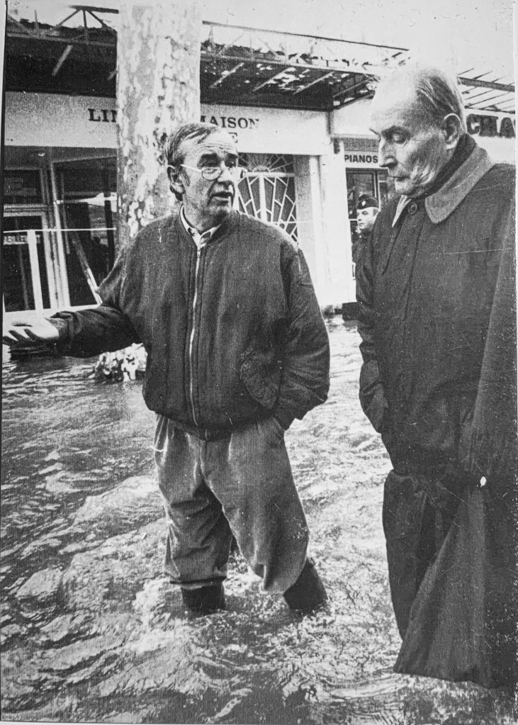 – en janvier 1994, la crue est de nouveau de grande ampleur, elle reçoit la visite du Président de la République François Mitterand qui se rend sur les lieux accompagné du Maire Michel BARON. la carte ci-après parle d’elle-même « vous allez gauger, Mr le Président »…