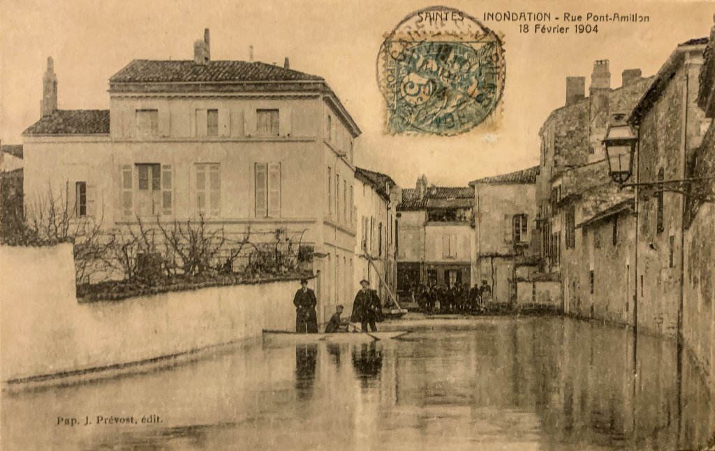 la Ville de SAINTES a toujours eu avec son fleuve un rapport intime. Tantôt lieu de promenade, de pêche, de navigation, de développement avec les gabares, tantôt synonyme de catastrophes avec les débordements du lit Majeur. La pente du fleuve étant quasi nulle jusqu’à l’océan, et les effets de la marée se faisant ressentir très à l’amont, les inondations deviennent rapidement spectaculaires, envahissant les rues basses de la Ville.