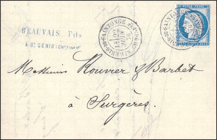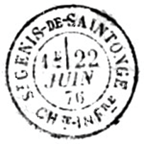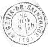 Courant 1873, le bureau de poste de Saint Genis de Saintonge a été doté d’un timbre au type 17 en remplacement de son timbre à date au type 16.