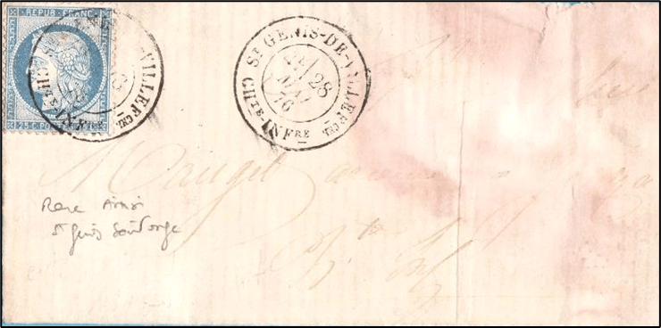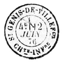– Pourquoi le libellé de ce timbre à date est « Saint Genis de Villefranche » ?, confusion d’un service de l’administration des Postes avec le nom du bureau de Saint Hilaire de Villefranche qui jusqu’en 1865 s’appelait Saint Hilaire de Saintonge ?