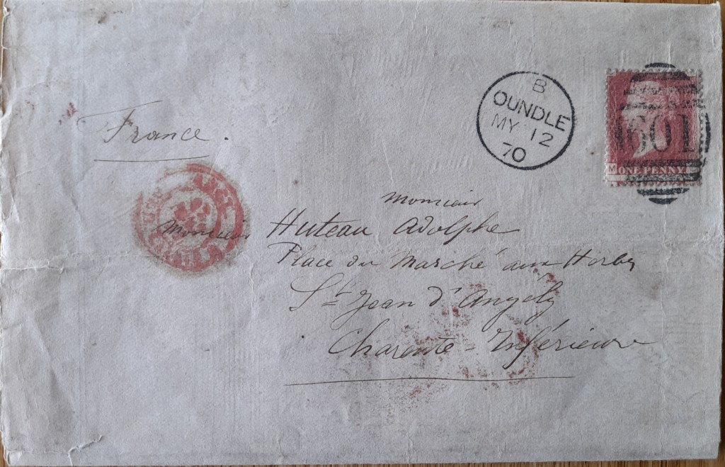 Nos amis anglais (certains diront nos meilleurs ennemis), ne manquent pas une occasion de se moquer des français, en voici encore un exemple… ce courrier est parti le 12 mai 1870 de OUNDLE en Angleterre, il est adressé à Adolphe HUTEAU, place du marché aux herbes à Saint-Jean d’Angely.