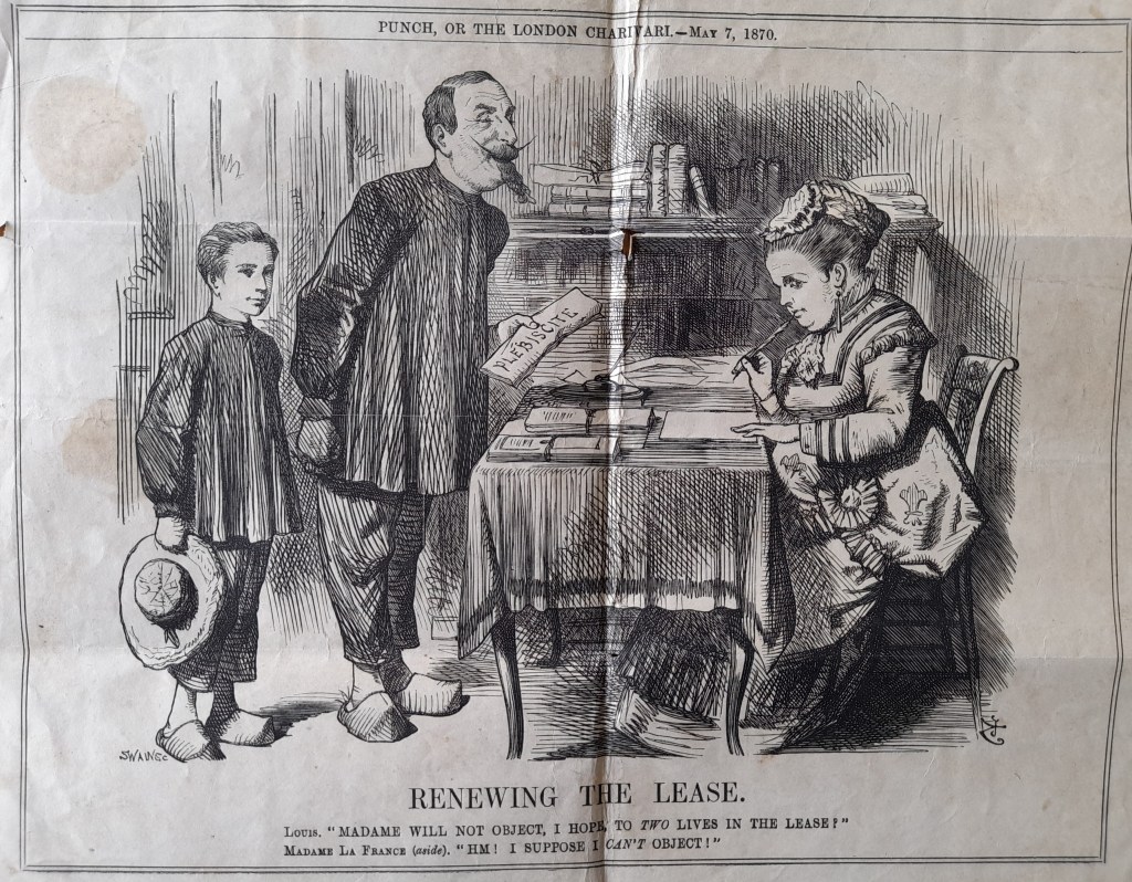 En dépliant le courrier, on découvre un extrait du journal Punch, or the London Charivari daté du 7 mai 1870 montrant Napoléon III demandant à madame la France « Madame ne s’opposera pas, j’espère, à deux vies dans le bail » sous le texte « renouveler le bail ». Et la France sous la forme de la secrétaire avec sa cocarde de répondre « hm ! je suppose que je ne peux pas m’y opposer »