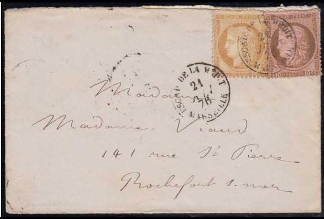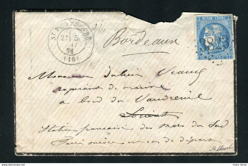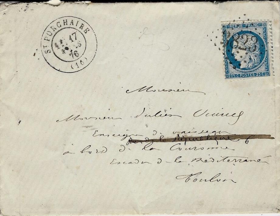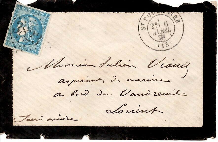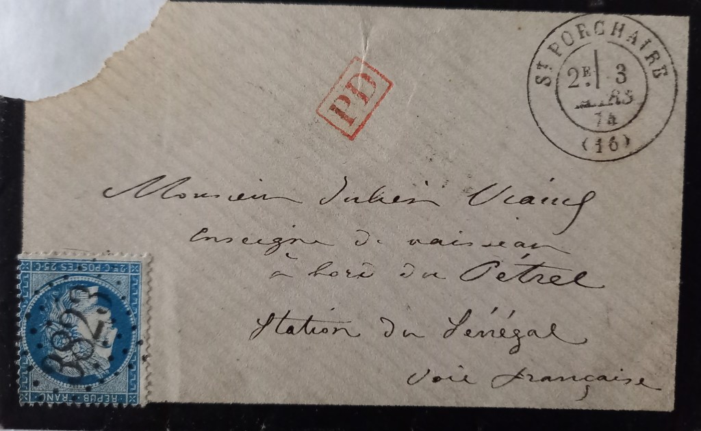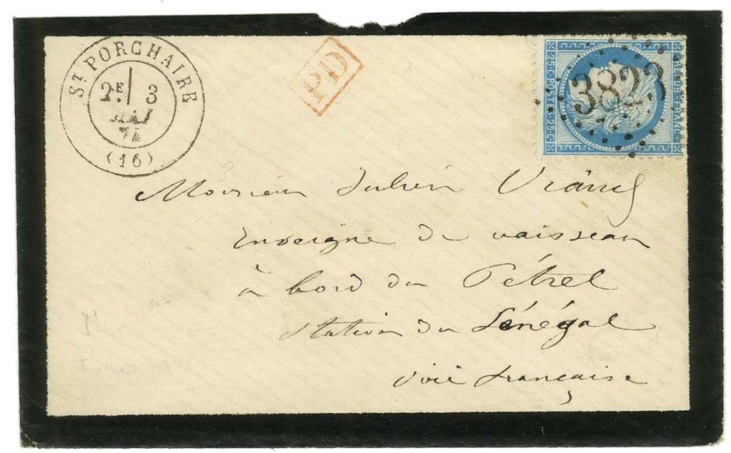 Voici une enveloppe expédiée de SAINT-PORCHAIRE et à destination de Julien VIAUD, aspirant de marine à bord du Vaudreuil. Julien VIAUD est plus connu sous le nom de PIERRE LOTI. Cette enveloppe de deuil est affranchie avec un 20c de l’émission de Bordeaux (n°45B) annulé par le Gros Chiffre 3823 du bureau de SAINT PORCHAIRE.