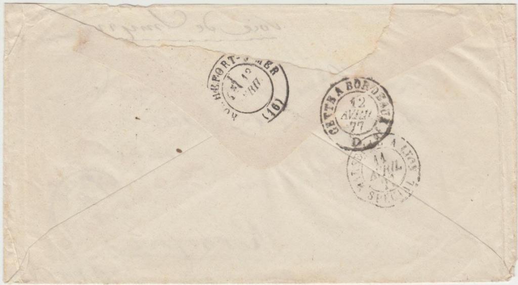 – Au recto : départ Smyrne 6 avril 1877, au verso ambulant Marseille à Lyon spécial le 11 avril, ambulant Cette (ancien nom de Séte ) à Bordeaux le 12 avril, Rochefort le 12, 4ème distribution.