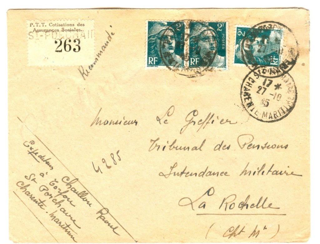 Saint Porchaire – Recommandé provisoire du 27.10. 1945 – Bas de feuille de timbres portant la mention « PTT Cotisation assurances sociales » + griffe du bureau