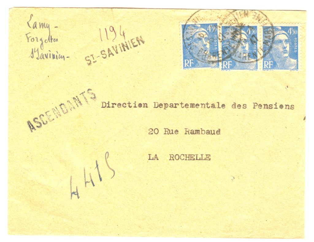 Saint Savinien – Recommandé provisoire du 15.4.1947 – griffe du bureau