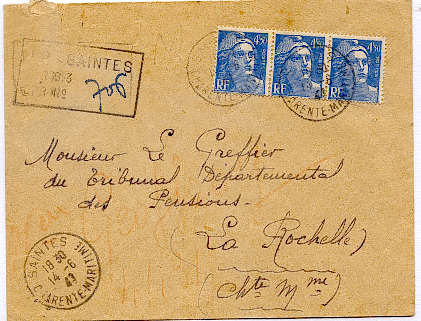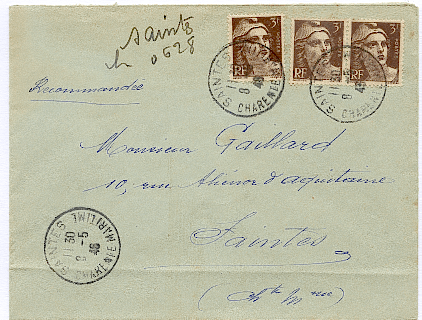Saintes Recommandé provisoire du 14/6/47 Griffe SAINTES LR -PLR G3 – OPR n°
