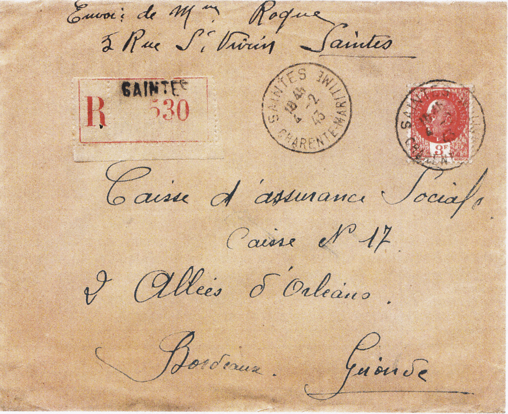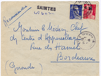 Saintes – Recommandé provisoire du 8.5.1946 – inscription manuelle de la recommandation