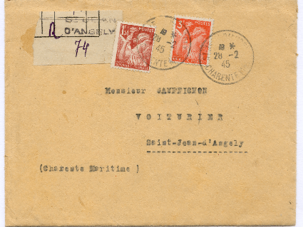 St Jean d’angély – Recommandé provisoire du 28 .2.1945