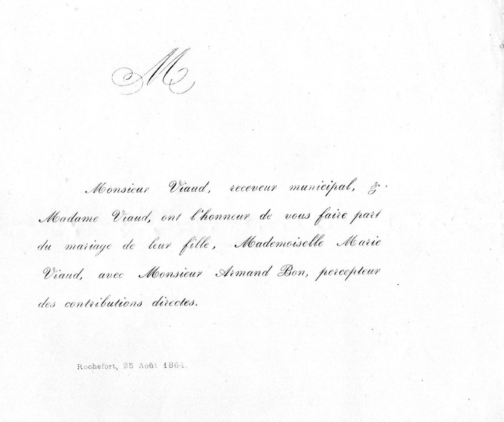 – Marie la soeur ainée de Pierre Loti, après son mariage en 1864, habitait à Saint-Porchaire. C’est au domicile de celle-ci que la famille se réunissait souvent et où Pierre Loti avait sa chambre personnelle lorsqu’il venait y passer quelques jours, ci-dessous le faire-part de son mariage:
