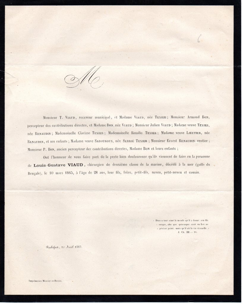 Voici le faire-part annonçant le décès de Louis-Gustave en 1865, chirurgien de deuxième classe dans la Marine, mort dans le golfe du Bengale à l’âge de 28 ans: