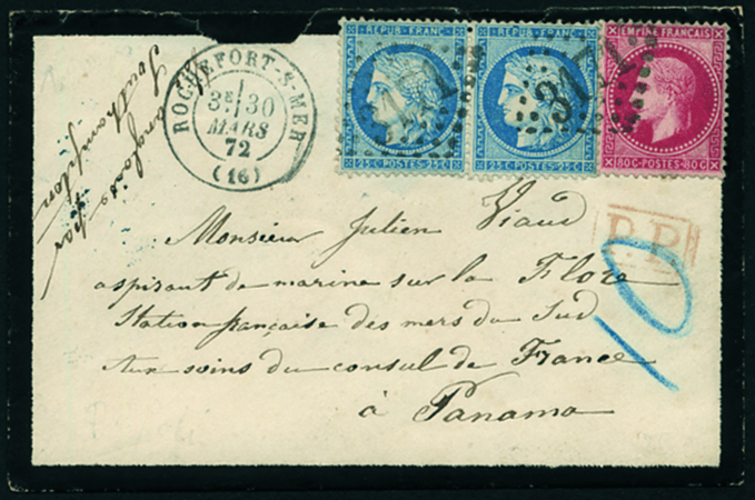 en 1872 il est aspirant de marine à bord du Flore, la lettre ci-dessous est à destination des stations des Mers du Sud « aux bons soins du Consul de France » à PANAMA. Taxe colombienne bleue 10 centavos, griffe PP Port Payé en rouge: