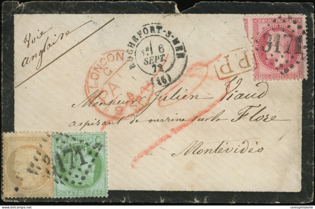Toujours à bord du Flore, la lettre ci-dessous est à destination de Montevidéo , capitale de l’URUGUAY. L’enveloppe est affranchie à 1F par 3 timbres n°53, 57 et 59, au départ de ROCHEFORT donc avec l’annulation par le gros chiffre 3171. La lettre est passée par LONDRES le 9/09 (cachet rouge). Son trajet complet est Rochefort, Paris, Calais, Douvres, Londres, Southampton puis la ligne maritime jusqu’à Montevidéo. Taxe Uruguayenne manuscrite de 10 centimos jusqu’à 14,7gr. Port Payé en rouge: