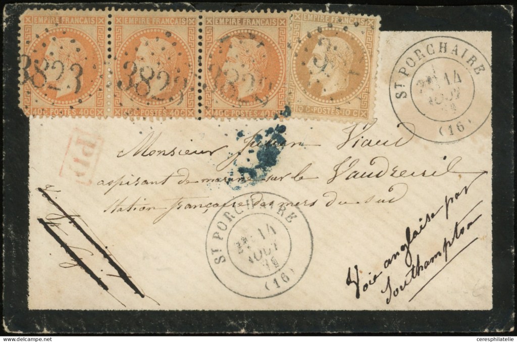 Le 14 aout 1871 cette enveloppe part de SAINT-PORCHAIRE pour la station française des Mers du Sud, et toujours à bord du Vaudreuil, non par la voie française par SAINT NAZAIRE (mention rayée) mais par la voie anglaise par SOUTHAMPTON. Elle est affranchie à 1F30 avec 1 n°28b et une bande de 3 n°31 (Empire Lauré), tous annulé par le gros chiffres 3823 de SAINT-PORCHAIRE. Cela correspond au tarif du 1er juillet 1871 jusqu’à 10gr.