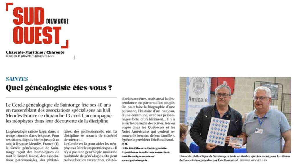 retour sur la participation de l’APCS aux 40ans du Cercle Généalogique de Saintonge, avec édition d’un timbre et d’un souvenir avec cachet officiel de la Poste: